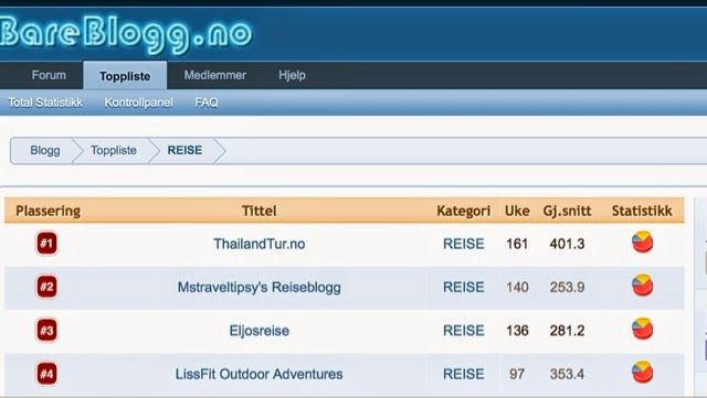 Men i dette innlegget vil jeg faktisk egentlig bare skryte litt av reisebloggen min, ja det høres kanskje nokså selvopptatt ut, men jeg vil også kaste litt lys over en reiseblogg som jeg synes ikke er så aller verst. Noe riktig må jeg da gjøre som har kommet inn på toppen av noen lister her på nettet. Ja som tidligere nevnt så er jeg jo registrert flere steder, men jeg synes det er helt greit for jeg vil jo at folk skal kunne se og finne bloggen lett. Det at jeg skriver innlegg på både norsk og engelsk gjør jo at flere kan lese innleggene og det er faktisk en del fra andre land som er inne og ser på bloggen. Så synes jeg det er verdt å nevne at selv om bloggen har vært der i flere år, så er det bare det siste året jeg virkelig har begynt å skrive på den og promotert den. Synes jo selv at jeg har kommet langt på kort tid, for å etablere seg en lesegruppe tar lang tid. Mye jobb blir det i alle fall, i hvert fall når man skal kombinere det med full jobb. Så var det dette med å få materiale til å skrive også da, det er jo noe jeg gjerne skulle ha prioritert ennå mer enn det jeg allerede gjør. Blir jo så klart noen reiser på meg, men jeg blir liksom ikke mettet innen dette området jeg da.